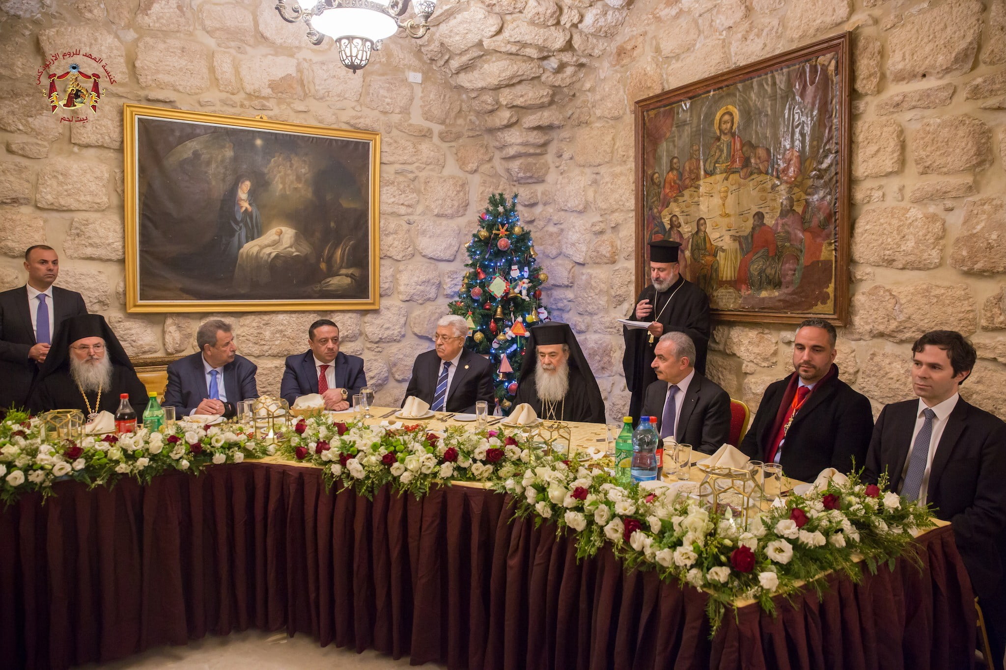Sofianopoulos, the Governor, Major General Kamel Hamid and Ramzi Khoury, Chairman of the Supreme Presidential Committee for Churches Affairs, the Minister of Tourism, Ms. , Leaders of the security services from Ramallah, and a commander The region, His Excellency Brigadier General Nader, Bethlehem Police Director, Brigadier General Tariq Al Hajj, Human Rights Officer, Brigadier Salim Al Qaisi, Director of Intelligence, Brigadier Hilal Abdel Haq, Director of Preventive Security, Military and Civil Liaison, Medical and Military Services and Civil Defense, a number of Palestinian ministers and officials and a large number of Orthodox parishioners in the city Bethlehem, and the banquet included a speech by His Excellency President Mahmoud Abbas “Abu Mazen” Where he welcomed the attendees and congratulated everyone on the arrival of Christmas, according to the eastern calendar. In his speech, His Beatitude Patriarch Theophilus III welcomed his Excellency and the representative of His Majesty King Abdullah II, the guests and the attendees, and praised President Mahmoud Abbas, the political and national leader of the Palestinian people and his wise policy, and said: We meet today in the cradle of Christ from which the light was emitted, the light of the world, the land of the Redeemer, to celebrate the anniversary of the birth of the Messenger of Love. And peace, in a land that yearns for peace, and under the leadership of its primary concern is to achieve peace to ensure a bright future for its people, who sacrificed a long time for their dignity and freedom and the realization of his legitimate dream of independence and self-determination.We believe that we are able to make peace and live by its requirements, no matter how difficult it is. This imposes on us a transcendence that raises us above the limits of our self, so we transcend them, so that we are able to look at the other as God looks to him, and accept the other as God accepts him, so that we realize and achieve justice and truth for us and others. It is Christmas this year and the Middle East region suffers regional tensions and conflicts. In Lebanon, the Lebanese are protesting the country’s deteriorating economic conditions, and in Syria, Christmas carries the hope that the country will witness a way out of the current impasse and that the next year will be a year of security and safety for Syrians with all their political, ethnic and religious affiliations, far from foreign interference. Yemen is still moving ahead with its internal war, which we pray for it to end as soon as possible. We also call on the Creator to give Iraq and Libya the stability it lost years