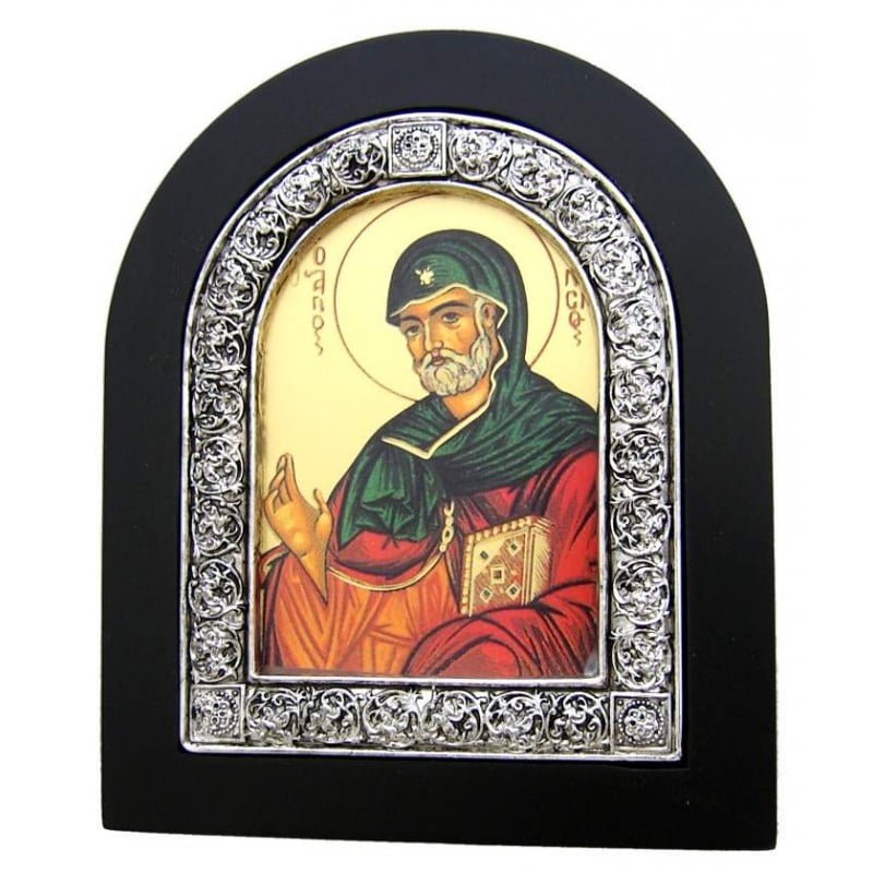 Saint Thenisuse Framed Icon IC138Black and Silver Round Frame Gold Colored BackgroundSize is 7 Inches By 5.7 Inches