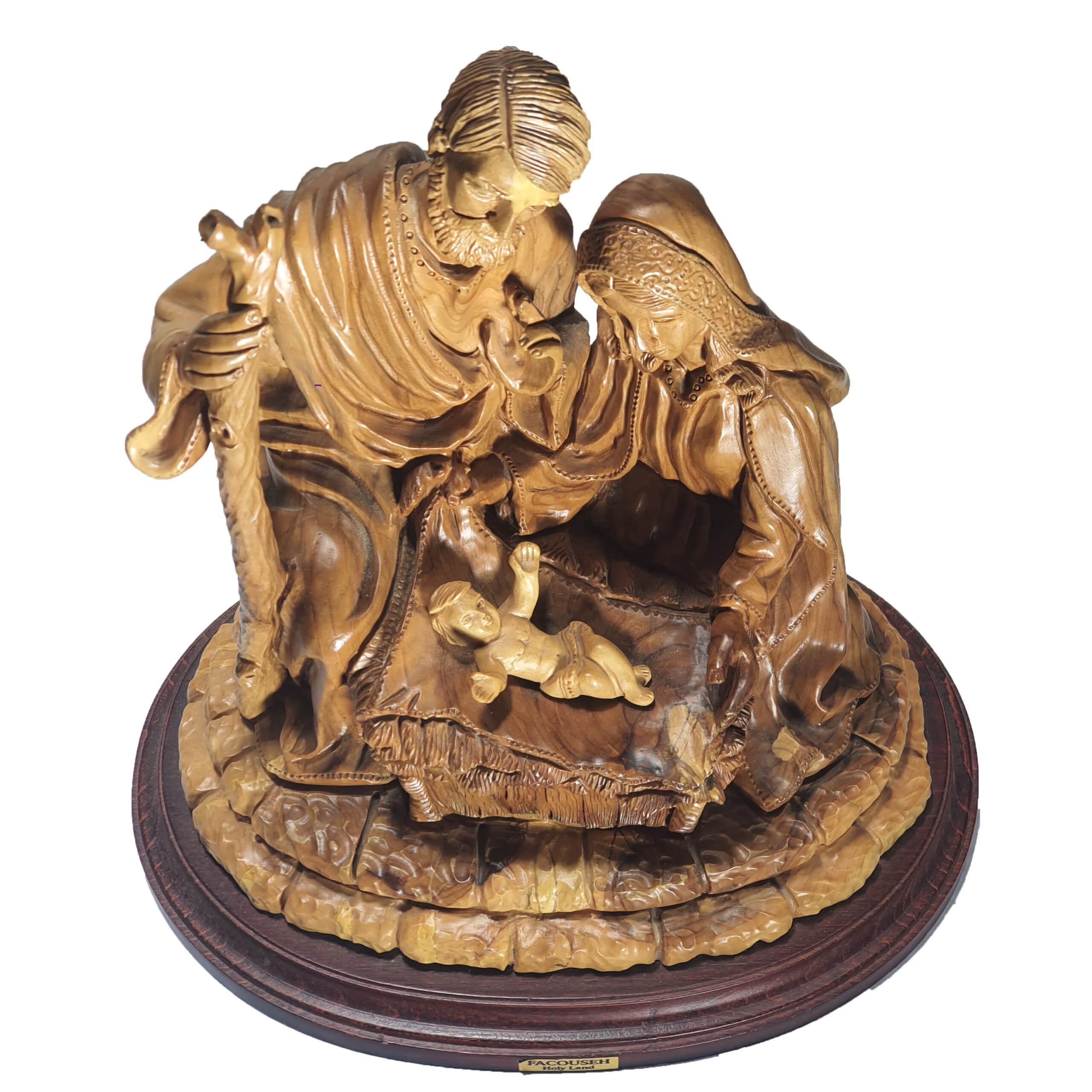 Observe the beautifully detailed curvature of olive wood in this wood carved statue. A serene nurturing feeling is expressed while Joseph and Mary look upon infant Jesus before the hardships they will endure. The three figures are perfectly set as you can feel God’s love is surrounding them with a hint of blissful light from the Holy Spirit.
