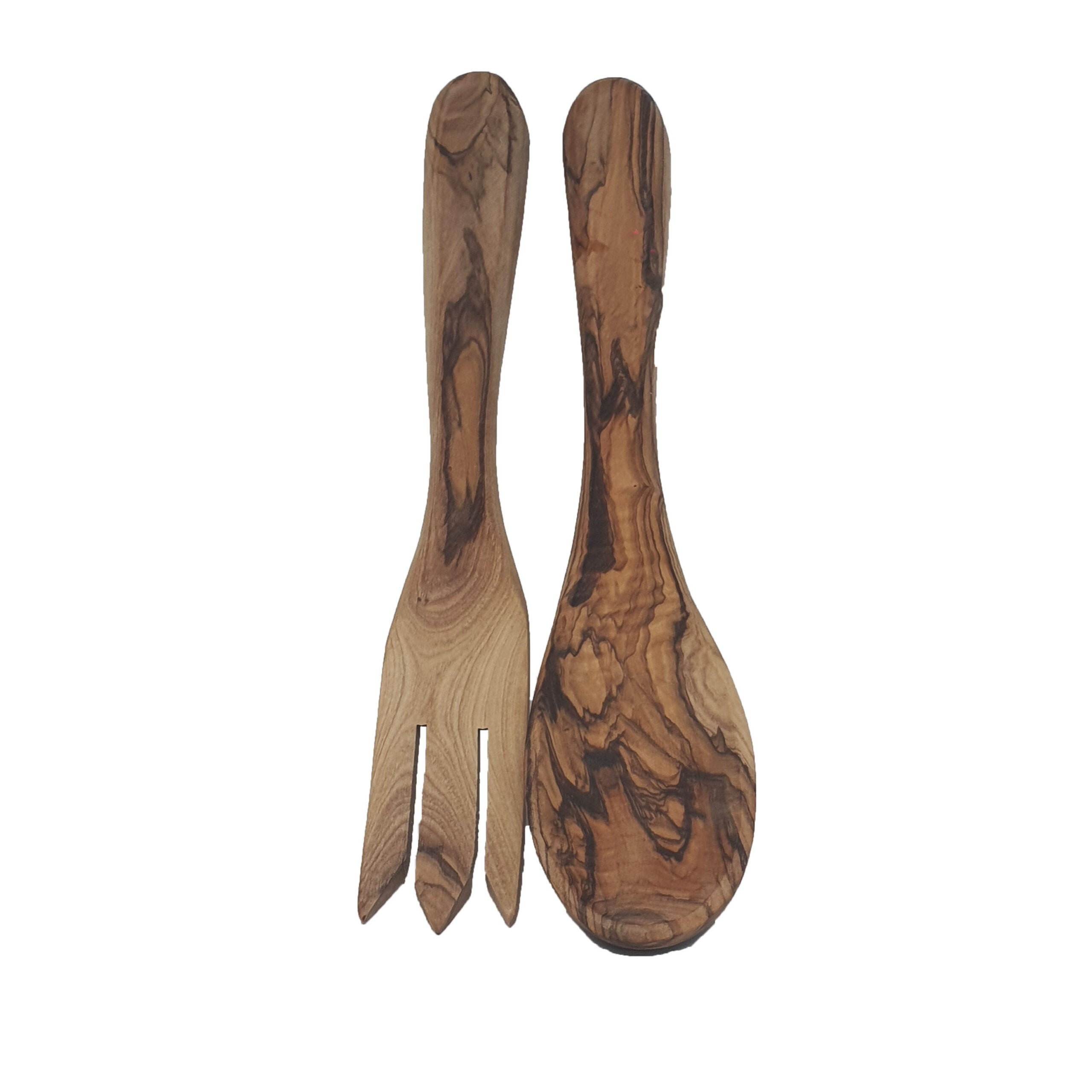 Olive Wood Spoon And Fork Set is well carved out of Premium Olive Wood trees from Bethlehem.The natural swirl and contrast of the olive wood grain will draw your mind.
