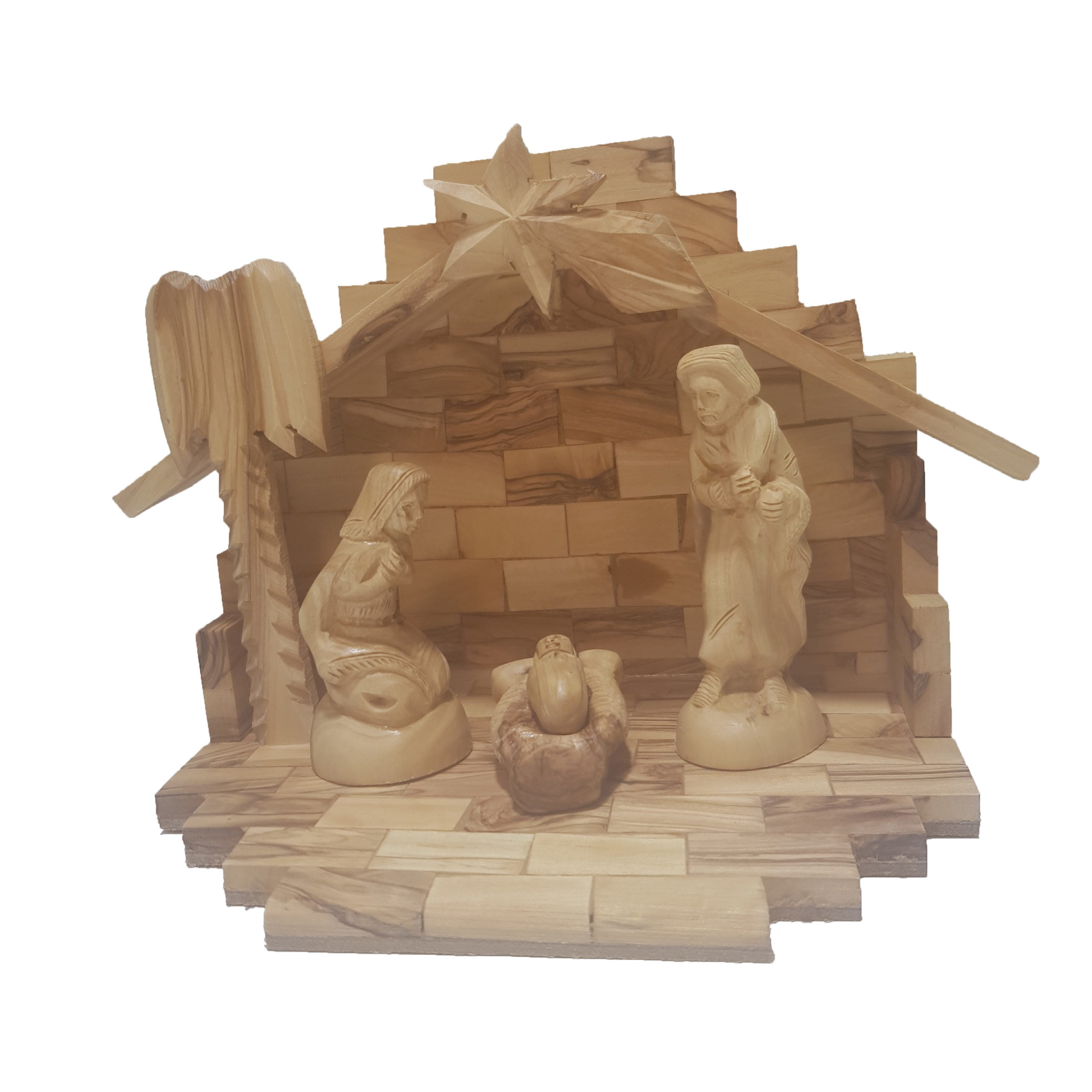 Modern Olive Wood Nativity Set With Stable. Figures Glued on. This set is well carved out of Premium Olive Wood from Bethlehem. This popular contemporary design will dazzle your guests. The faceless statues allow people to project any face they desire. The natural swirl and contrast of the olive wood grain will draw your mind. It will add a magnificent décor to your home during the holidays. Figures bout 2.25″ in height. Stable is about 6.5″ in height. Comes with an explanation card. Great for Children.
