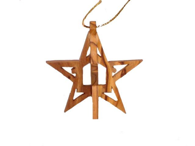 Star Of Bethlehem Nativity Ornament. This exclusive 3-D ornament is hand carved in Bethlehem, the Holy Land. A scroll saw is used to carve this intricate design. The rich color and interesting veins are characteristic of the beautiful Bethlehem Olive Wood. This ornament comes ready to hang complete with a golden string and an explanation card (describing the workmanship). Add a beautiful décor to your Christmas Tree. A wonderful Ornament Party Gift.
