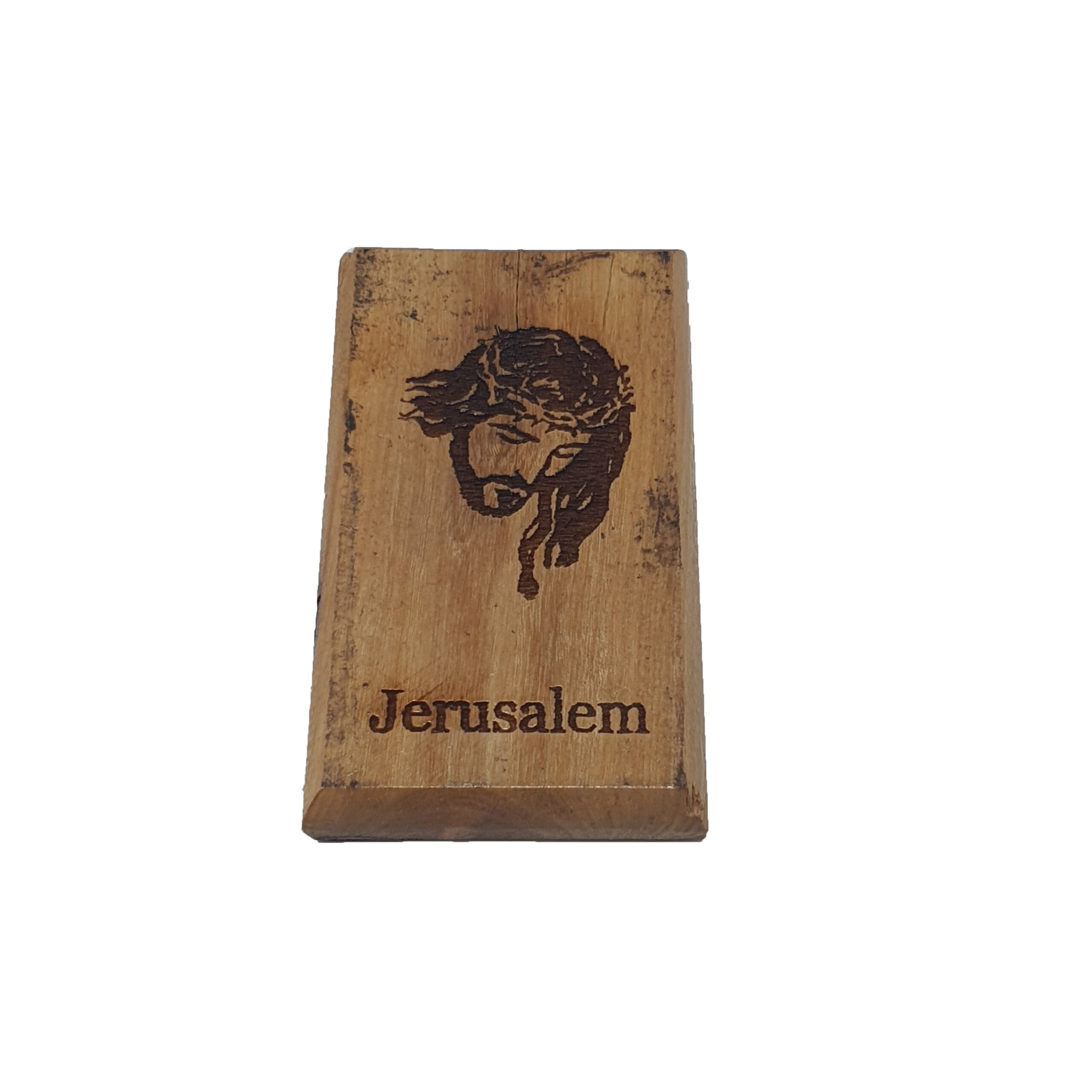 Olive wood magnet, hand-made by expert craftsmen in the Holy Land with laser engraving depicting Jesus and carrying the writing Jerusalem .